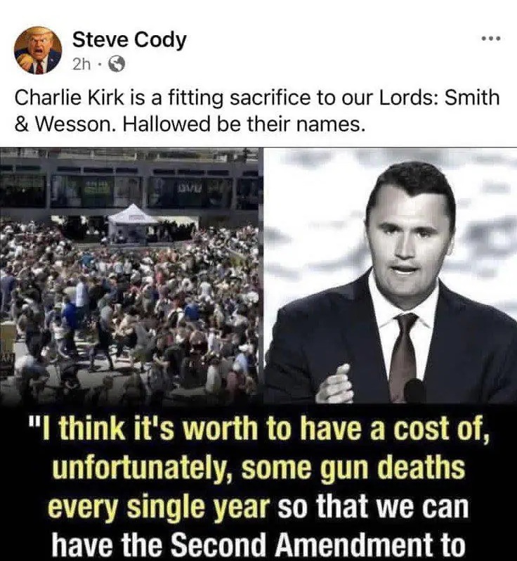 “Charlie Kirk es un sacrificio apropiado para nuestros señores: Smith & Wesson. Santificados sean sus nombres”, apuntó el concejal demócrata.