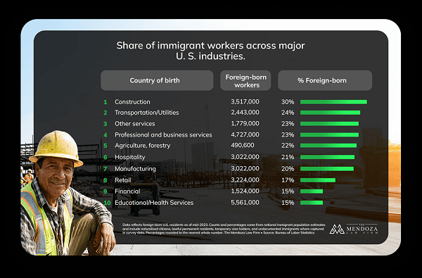 Según el estudio de Bufete Mendoza, el 30 % de los trabajadores de este sector nació fuera de Estados Unidos, lo que representa más de 3 millones de personas.