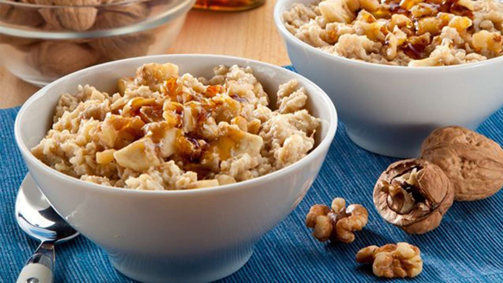 - Sirve en un tazón, añade el plátano en rodajas y las nueces encima.