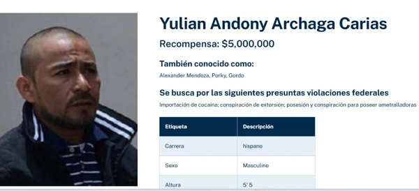 Archaga es acusado de liderar las operaciones de la pandilla MS-13 en Honduras y de coordinar el envío de grandes cantidades de cocaína hacia Estados Unidos. La recompensa por su captura asciende a 5 millones de dólares.