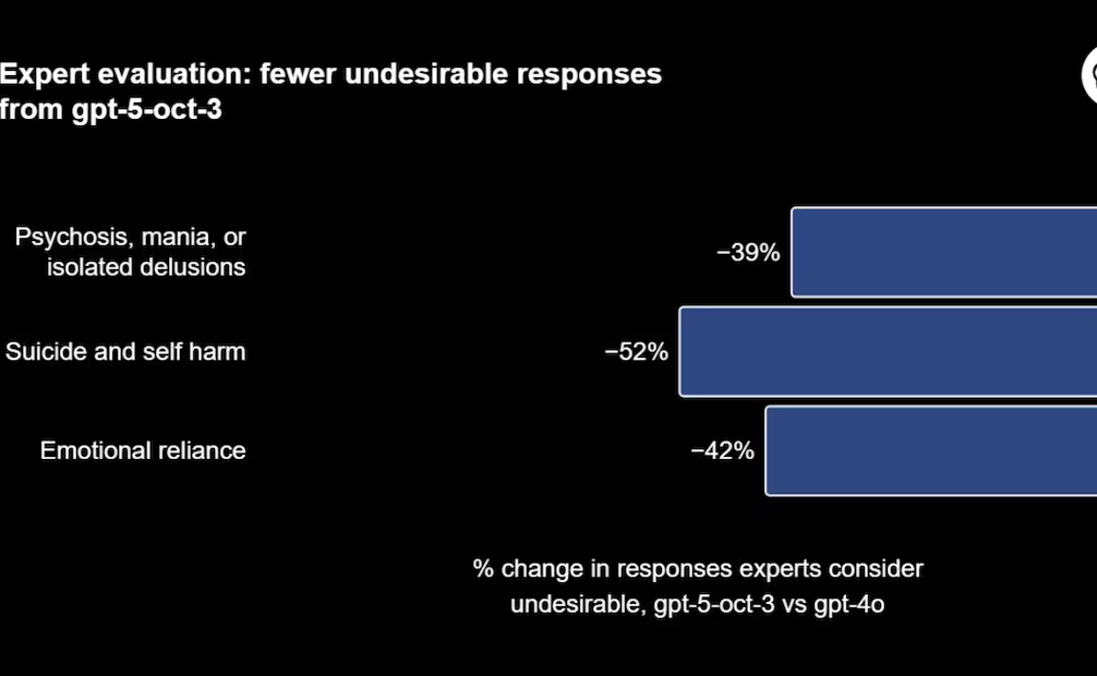 OpenAI explicó que expertos médicos revisaron más de 1,800 respuestas relacionadas con posibles psicosis, suicidio y apego emocional y compararon las respuestas de la última versión de GPT-5 con las producidas por GPT-4o.