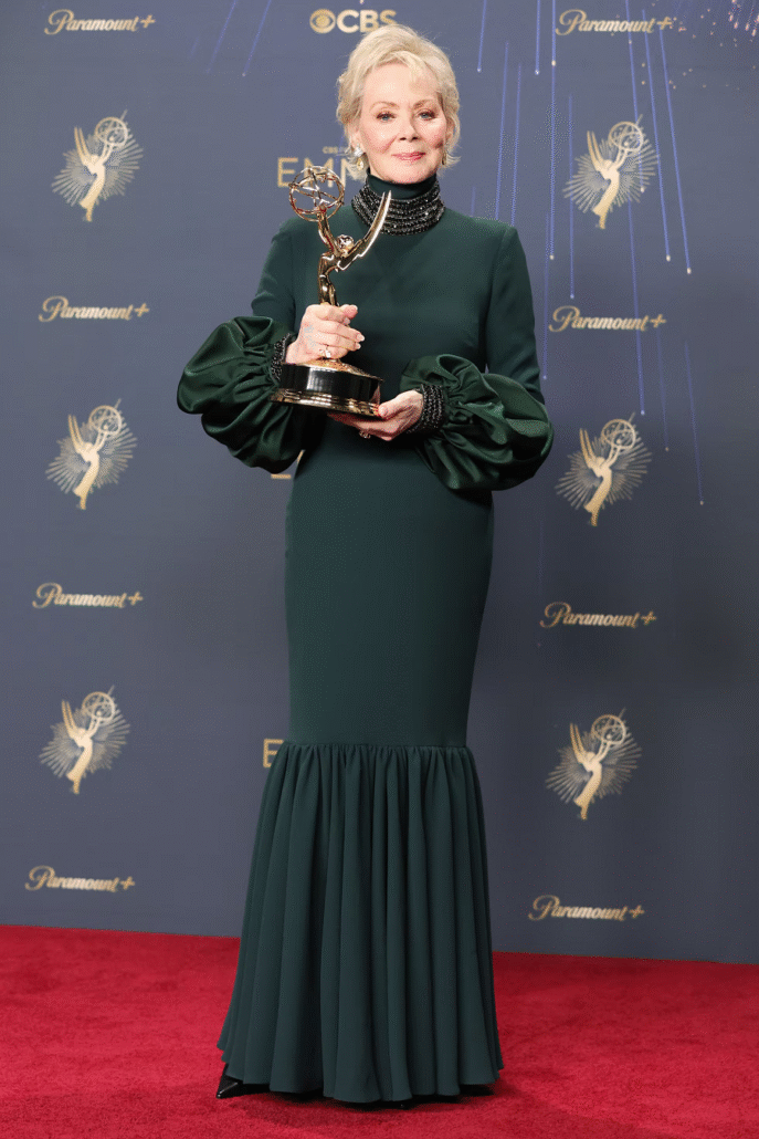 La icónica actriz celebró su cuarto Emmy por Hacks, enfundada en un vestido verde botella de manga larga.