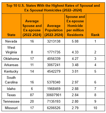 Los investigadores utilizaron datos del FBI Crime Data Explorer y las tasas por millón de habitantes se calcularon utilizando la población promedio del estado. De esta manera, lograron identificar dónde los residentes enfrentan el mayor riesgo de violencia doméstica letal.